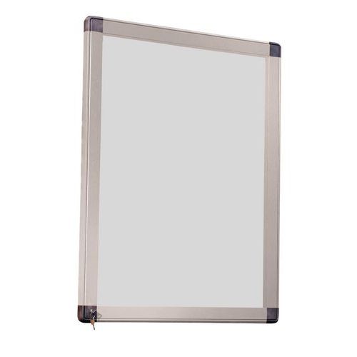 Bacheca per esterni, sigillata e naturalmente ventilata. Sigillatura garantita da una tenuta elastomerica con circolazione d'aria: evita i fenomeni di condensa. Fondo magnetico per tenere facilmente in posizione i documenti da affiggere. Anta a battente per un facile accesso all'intera superficie della bacheca. Angoli arrotondati in policarbonato iniettato grigio. Con serratura di sicurezza. Colori blu RAL 5000, rosso RAL 3011, beige RAL 1019, grigio RAL 7005.