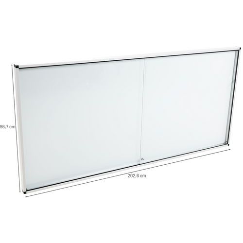 Bacheca per affissioni per interni robusta, sicura e leggera. Superficie magnetica in acciaio laccato per l'affissione dei vostri documenti tramite puntine magnetiche. Anta scorrevole con serratura trasparente, offre un'eccellente visibilità del materiale esposto. Bacheca in vetro rinforzato con spessore di 5 mm per maggiore sicurezza. Con serratura e 2 chiavi fornite.
