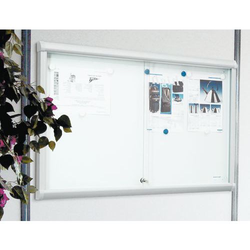 Bacheca per affissioni per interni con cornice in alluminio anodizzato e ante scorrevoli bloccabili tramite serratura sul davanti. Fondo in lamiera laccata per una scrittura cancellabile a secco e per l'affissione dei documenti tramite puntine magnetiche. Anta in vetro Securit trasparente da 4 mm con ottima resistenza agli urti e agli shock termici. Il vantaggio del vetro Securit è che, in caso di rottura, si frammenta in piccoli pezzi per evitare incidenti.