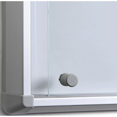 Bacheca per interni con fondo magnetico. Sicurezza ottimale, angoli arrotondati stampati a iniezione, porte scorrevoli in vetro e spessore minimo. Ideale per corridoi interni e l'affissione di istruzioni per l'evacuazione di emergenza. Scrivibile e magnetico, fondo in metallo di buona qualità. Profondità interna da 30 mm. Certificazione B1 di resistenza al fuoco (EN 13501 – 1 Classe C).