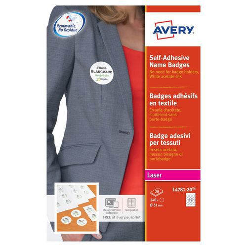 | Descrizione | Badge adesivo in tessuto Ø 51 mm, Colore: Bianco, Tipo di fissaggi: Adesiva |