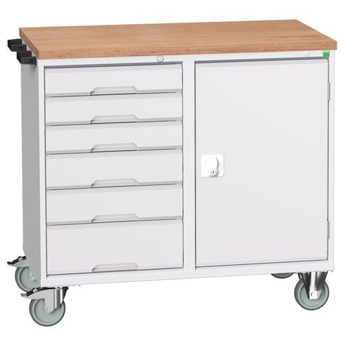 Banco da lavoro mobile robusto e bloccabile con solido piano in multistrato. Per riporre gli oggetti personali chiudendo a chiave i cassetti. Stabile grazie al sistema di chiusura individuale dei cassetti, che consente di aprirli solo singolarmente. Dotato di 4 ruote in gomma, di cui 2 girevoli con freno. Realizzato nel Regno Unito Carico max. (kg) : 300