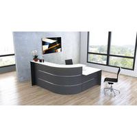 Bancone per reception angolare Bari con estensione per scrivania inferiore composto da un elemento rotondo e uno dritto. Il bancone per reception angolare Bari con estensione per scrivania inferiore è un elemento modulare in legno / acciaio. I pannelli di legno sono in melaminico con bordi in ABS. Passaggio cavi integrato. La facciata è decorata con delle strisce in acciaio inossidabile. Compatibile con il modulo di estensione per reception Bari. Viti comprese Passaggio cavi incluso.