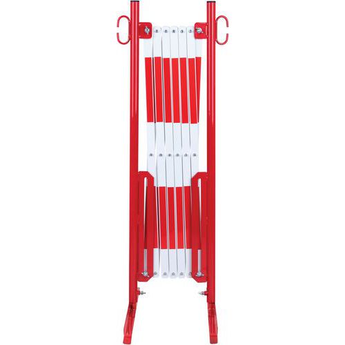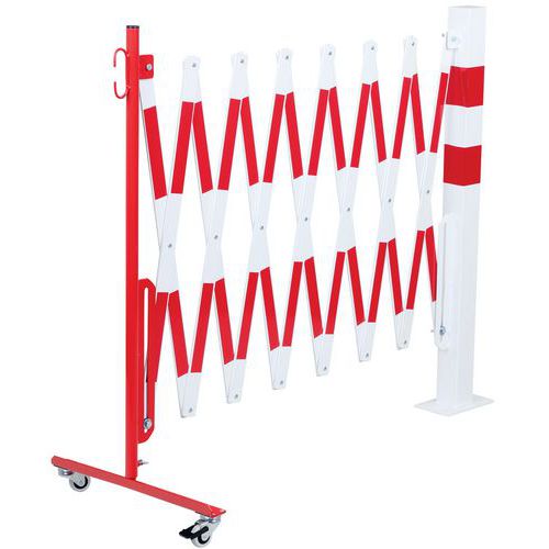 Barriera allungabile in acciaio con rotelle e palo quadrato per la delimitazione temporanea. Strisce bicolore per una maggiore visibilità. Adatto solo per uso interno. Facile da maneggiare, riporre e utilizzare grazie alle sue ruote con freno. Certificato TÜV. Base 120x195 mm.
