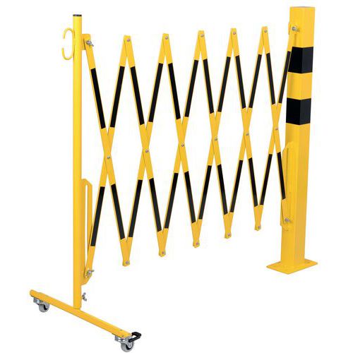 Barriera allungabile in acciaio con rotelle e palo quadrato per la delimitazione temporanea. Strisce bicolore per una maggiore visibilità. Adatto solo per uso interno. Facile da maneggiare, riporre e utilizzare grazie alle sue ruote con freno. Certificato TÜV. Base 120x195 mm.
