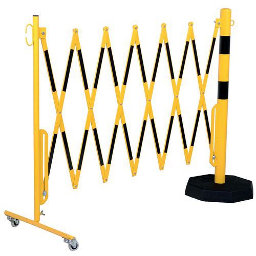 Barriera di protezione estensibile su rotelle con freni da un lato e paletto di protezione dall'altro. Consente di delimitare temporaneamente un'area di accesso vietato. Il palo consente un'installazione stabile di barriere in luoghi in cui il fissaggio a muro non è possibile. Paletto con base pesante 8 kg. Certificato TÜV.
