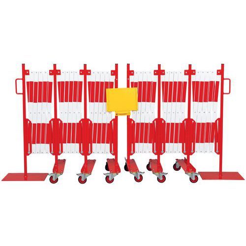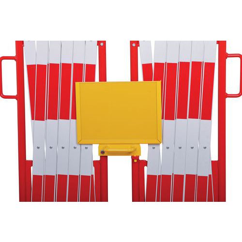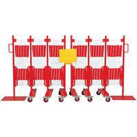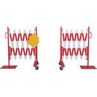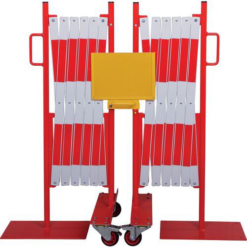 Insieme di barriere estensibili per bloccare e proteggere temporaneamente l'accesso a grandi superfici. L'elemento di fissaggio centrale consente di collegare le 2 barriere tra loro ma anche di visualizzare una nota informativa formato A4. Solido e stabile: barriere su ruote con freni per un utilizzo semplice e sicuro. Rivestito a polvere. Certificato TÜV. Facili da spostare grazie alle maniglie.