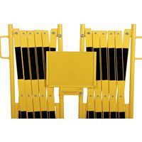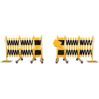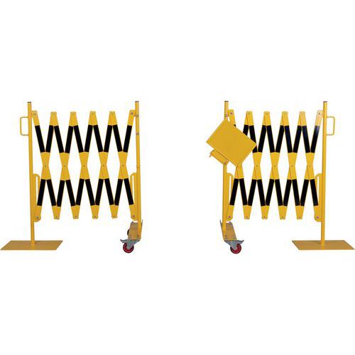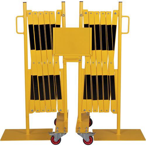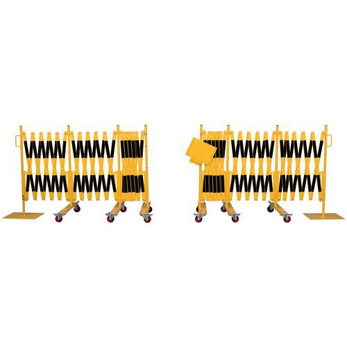 Insieme di barriere estensibili per bloccare e proteggere temporaneamente l'accesso a grandi superfici. L'elemento di fissaggio centrale consente di collegare le 2 barriere tra loro ma anche di visualizzare una nota informativa formato A4. Solido e stabile: barriere su ruote con freni per un utilizzo semplice e sicuro. Rivestito a polvere. Certificato TÜV. Facili da spostare grazie alle maniglie.