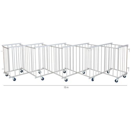 Barriera estensibile autoportante e robusta. Sopporta forti pressioni: adatta a qualunque evento che preveda un pubblico (manifestazioni sportive e culturali, concerti, saloni, stadi, parchi divertimento,...). Semplice da usare e da riporre: facile e veloce da montare. Si apre su rotelle e diventa stabile in 5 secondi. Bloccaggio delle rotelle: mediante pressione sul freno. Perno e viteria inox: resiste alle intemperie senza rischio di ruggine. Le rotelle sono composte da: ruote in gomma blu, coperture in acciaio zincato, imbutite e girevoli.