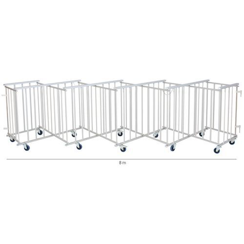 Barriera estensibile autoportante e robusta. Sopporta forti pressioni: adatta a qualunque evento che preveda un pubblico (manifestazioni sportive e culturali, concerti, saloni, stadi, parchi divertimento,...). Semplice da usare e da riporre: facile e veloce da montare. Si apre su rotelle e diventa stabile in 5 secondi. Bloccaggio delle rotelle: mediante pressione sul freno. Perno e viteria inox: resiste alle intemperie senza rischio di ruggine. Le rotelle sono composte da: ruote in gomma blu, coperture in acciaio zincato, imbutite e girevoli. Realizzato nell'UE