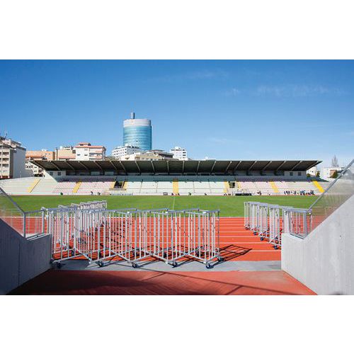 Barriera estensibile autoportante e robusta. Sopporta forti pressioni: adatta a qualunque evento che preveda un pubblico (manifestazioni sportive e culturali, concerti, saloni, stadi, parchi divertimento,...). Semplice da usare e da riporre: facile e veloce da montare. Si apre su rotelle e diventa stabile in 5 secondi. Bloccaggio delle rotelle: mediante pressione sul freno. Perno e viteria inox: resiste alle intemperie senza rischio di ruggine. Le rotelle sono composte da: ruote in gomma blu, coperture in acciaio zincato, imbutite e girevoli.