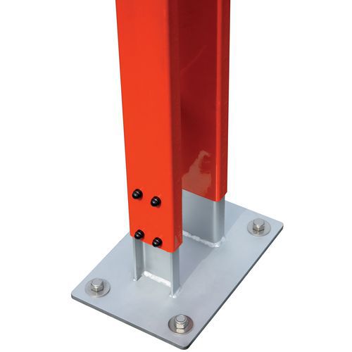 Barriera di sollevamento su piastre, con traversa in alluminio e bande catarifrangenti rosse. Doppia serratura triangolare di sicurezza e cilindro europeo. Sistema di blocco in posizione chiusa/aperta. Contrappeso integrato. Supporto per freccia di sicurezza con possibilità di alloggiare una catena (non fornita). Supporti e piastre in acciaio galvanizzato a caldo. Nottolino d'arresto in posizione chiusa e aperta.