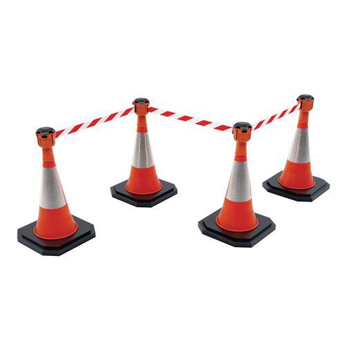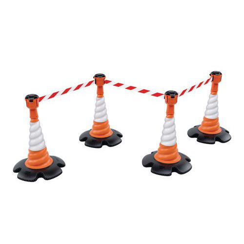 Ogni unità è dotata di 9 metri di nastro in tessuto di alta qualità completamente retrattile rosso/bianco o giallo/nero.