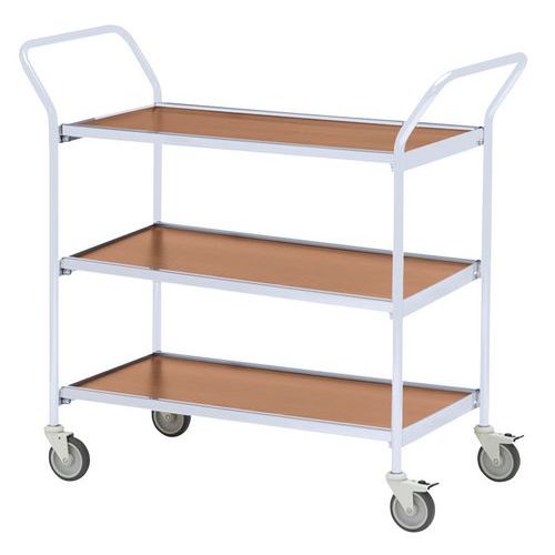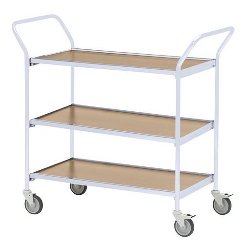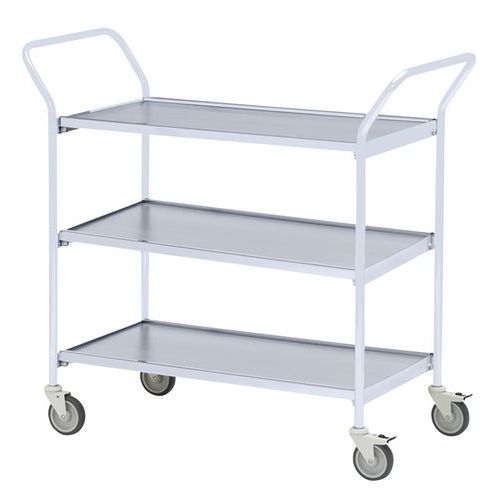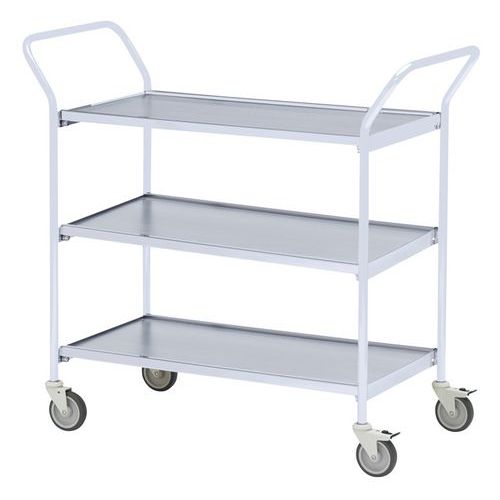 Base carrellata con struttura in finitura grigia, 3 ripiani e 2 maniglie di spinta.