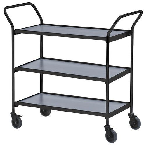 Base carrellata con struttura in finitura nera, 3 ripiani e 2 maniglie di spinta. Ripiano robusto con bordo da 25x20 mm e spessore di 12 mm. Con 4 rotelle girevoli Ø 100 mm di cui 2 con freno, rivestimento in gomma colore grigio.