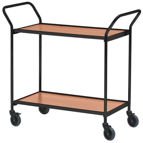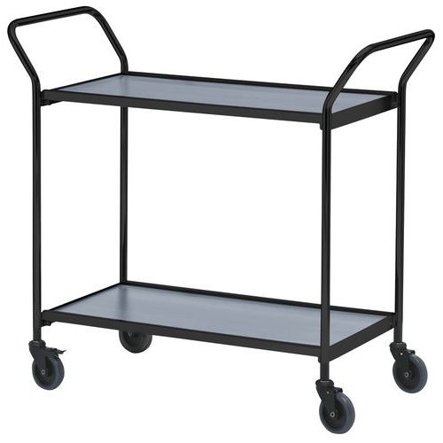 Base carrellata con finitura nera, 2 ripiani e 2 maniglie di spinta. Ripiano robusto con bordo da 25x20 mm e spessore di 12 mm. Con 4 rotelle girevoli Ø 100 mm di cui 2 con freno, pneumatico in gomma colore grigio.