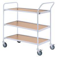 Base carrellata con struttura grigia, 3 ripiani con maniglia di spinta e archetto tubolare. Bordi tubolari da 22 mm e ripiano con spessore da 12 mm. Carico massimo per ripiano di 100 kg. Con 4 ruote girevoli di cui 2 con freno.