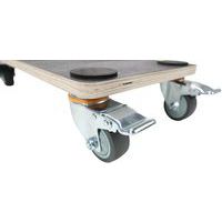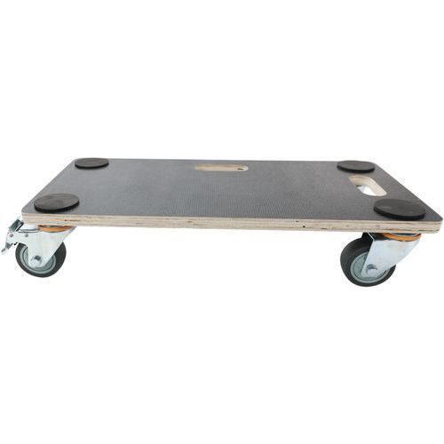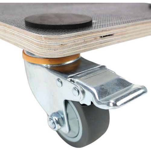 Base carrellata rettangolare in legno con rivestimento antiscivolo. Maniglia di movimentazione integrata. Capacità di carico di 200 kg. Con 4 ruote girevoli di cui 2 con freno.