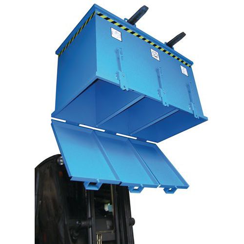 - Il fondo apribile che consente lo svuotamento rapido e immediato del contenuto direttamente a bordo del carrello elevatore grazie alla pratica leva di apertura laterale.