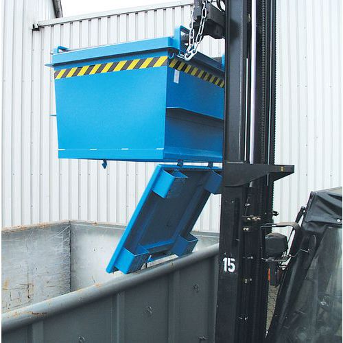 Benna con fondo apribile blu Bauer. Struttura stabile con profilo rinforzato per una maggiore durata. Si sposta facilmente con l'ausilio di un carrello elevatore o di una gru. Apertura del fondo semplice e rapida con un cordino. Svuotamento in una volta sola grazie al fondo apribile.
