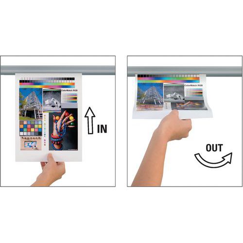 - Profilato in alluminio con rotoli in plastica che fungono da pinza per i fogli.
