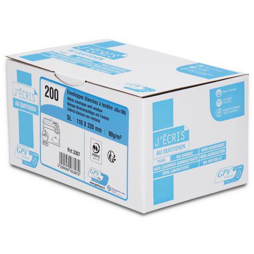 Busta bianca 90 g con finestra ad apertura rapida. Chiusura sicura con incollaggio rinforzato. Scatola dispenser a cerniera riutilizzabile. Prodotto proveniente da foreste ecosostenibili. Finestra in pellicola opaca.