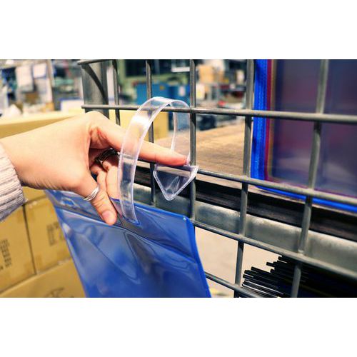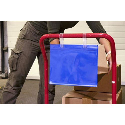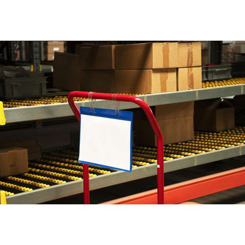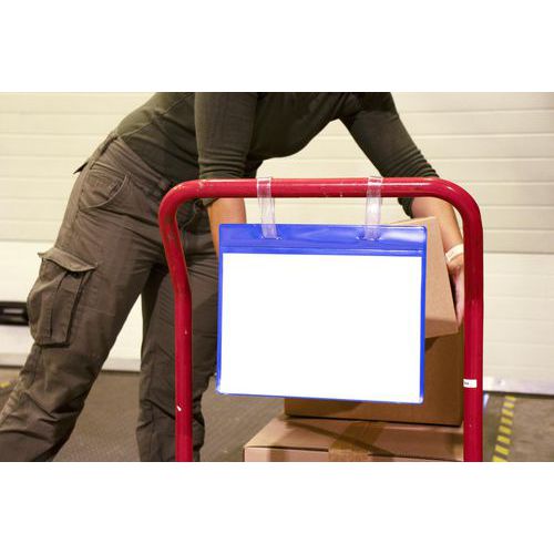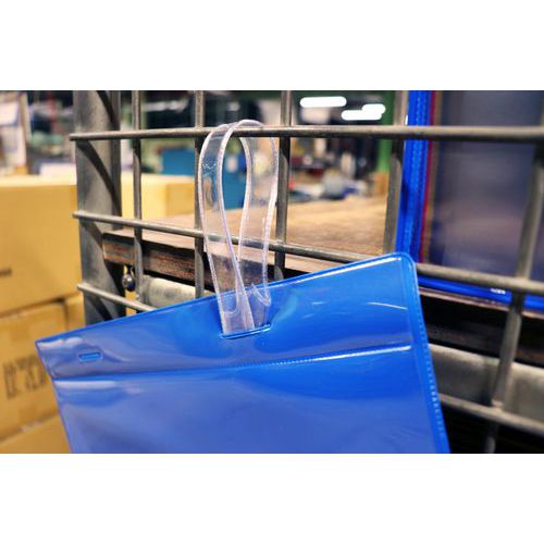 Busta per identificazione logistica da appendere con cinghia di taglia unica adattabile a tutti i formati di busta. Larghezza della cinghia compatibile con la maggior parte dei pannelli a griglia per una tenuta perfetta. L'apertura laterale protegge il documento dalla polvere e dalle gocce d'acqua.