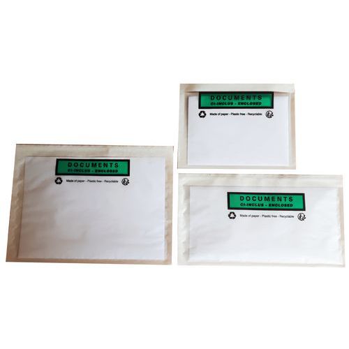 Scatola da 1000 buste adesive portadocumenti stampate in inglese e francese, in carta trasparente.