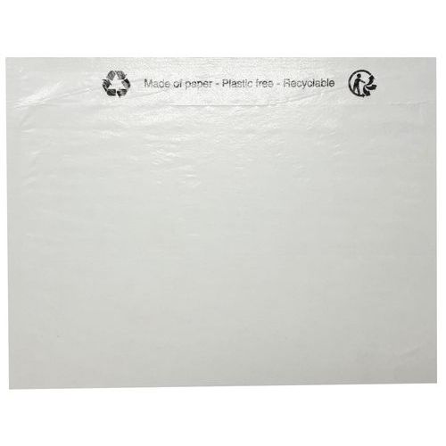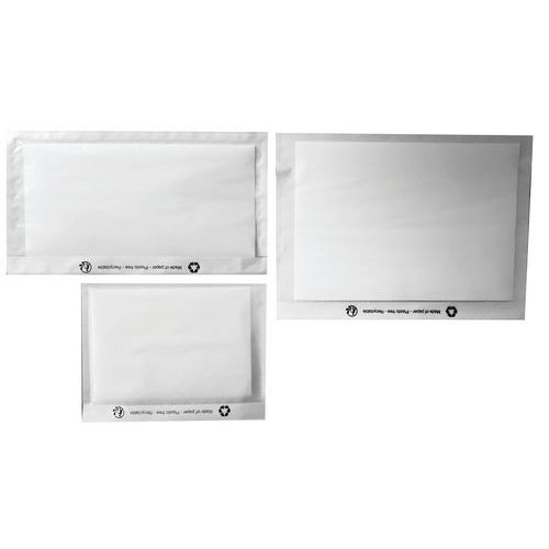 Scatola da 1000 buste adesive portadocumenti ecologiche neutre in carta trasparente.