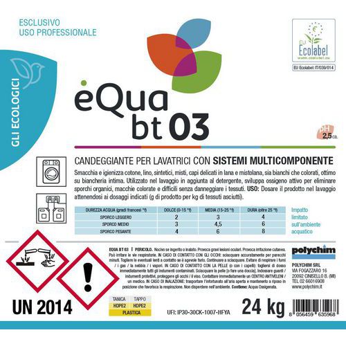 | Descrizione | Candeggiante smacchiante per lavatrici EQUA BT 03, Confezionamento: Bottiglia, Peso: 24 kg |