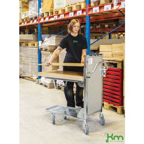 | Descrizione | Carrello a ripiani ergonomici 960x530 4 ruote girevoli con freno, Rotella Ø: 125 mm, Portata: 300 kg |