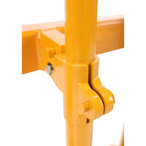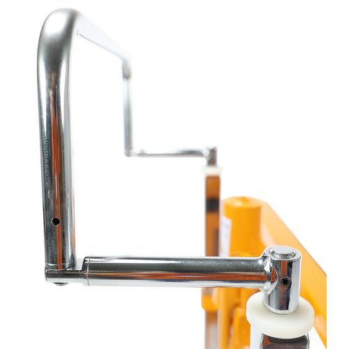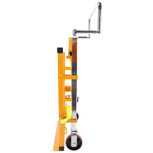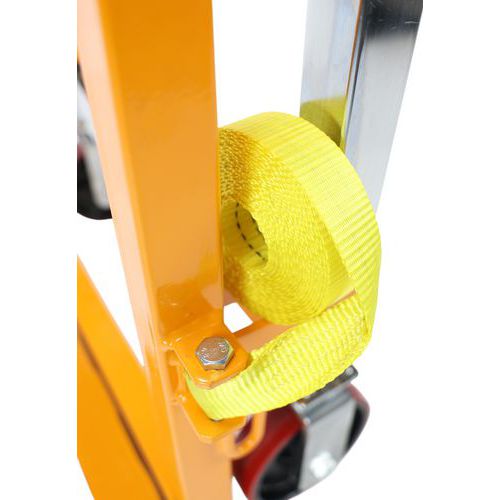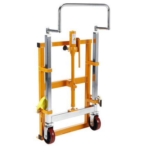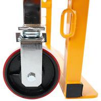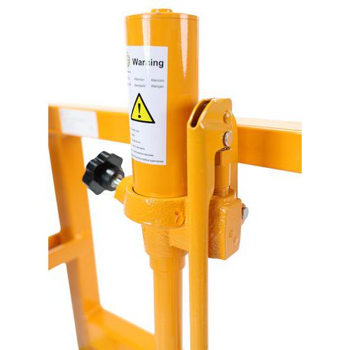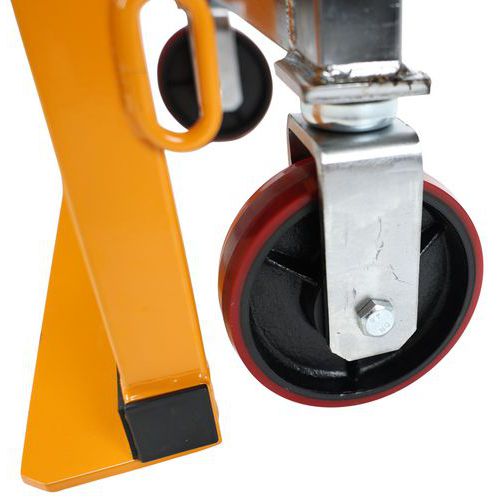 Pala a sollevamento manuale, azionata da una pompa idraulica, altezza di sollevamento 250 mm. Banda in gomma espansa per proteggere i carichi trasportati. 2 rotelle girevoli portanti e di guida per carichi pesanti. Carrello elevatore con ruote gommate in poliuretano. Larghezza delle ruote: 40 mm.