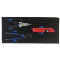 Carrello con 6 cassetti fornito con: Modulo in espanso 2/3 con 2 set di chiavi maschio Modulo in espanso 1/3 con 6 cacciaviti Modulo in espanso 1/3 con 4 utensili per serraggio/avvitamento Modulo in espanso 1/3 con 20 utensili 1/2" Modulo in espanso 1/3 con 9 chiavi miste a cricchetto Modulo in espanso 1/3 con 9 chiavi a pipa Modulo in espanso 1/3 con 4 pinze Modulo in espanso 1/3 con 1 mazzetta e 1 mazzuolo Modulo in espanso 1/3 con 3 utensili da taglio