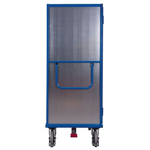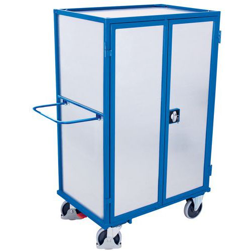 Carrello con ripiani robusto con struttura saldata meccanicamente e ante a battente a chiave. Rivestimento epossidico resistente agli urti e ai graffi. Ruote con rivestimento in gomma termoplastica antitraccia con cuscinetto a sfere di precisione. Dotato di un pedale con freno centralizzato EasySTOP che si attiva con un semplice movimento del piede. Questo sistema di frenata consente di bloccare le ruote del carrello in tutta sicurezza. Carrello con ripiani ergonomico di semplice utilizzo che necessita solamente di piccoli movimenti. Portata (kg) : 500