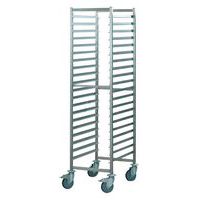 Carrello con guide in inox 18/10. Distanziamento di 75 mm. Profili rialzati in corrispondenza delle estremità per garantire la massima sicurezza di contenimento dei ripiani e delle griglie durante l'uso. Dotato di 4 rotelle girevoli, Ø 125 mm di cui 2 con freno, in poliammide e paracolpi rotondi.