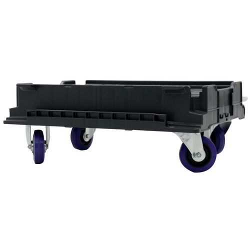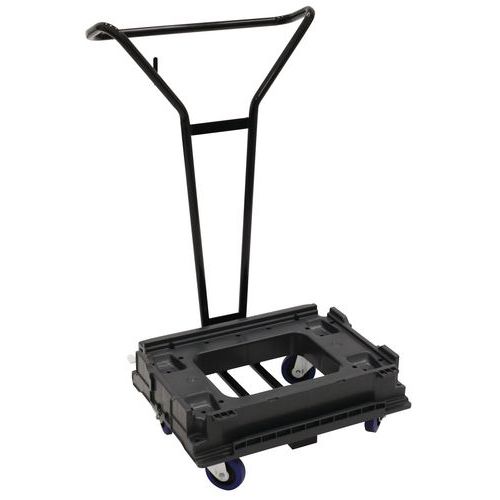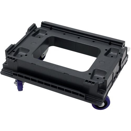 Carrello ergonomico e solido per contenitori impilabili. Facili da collegare: basta farli scivolare da un carrello all'altro. Carrello a ingombro ridotto, impilabile se vuoto. Facile da scollegare semplicemente premendo un pedale. 4 rotelle girevoli con battistrada in gomma, di cui 1 con freno.