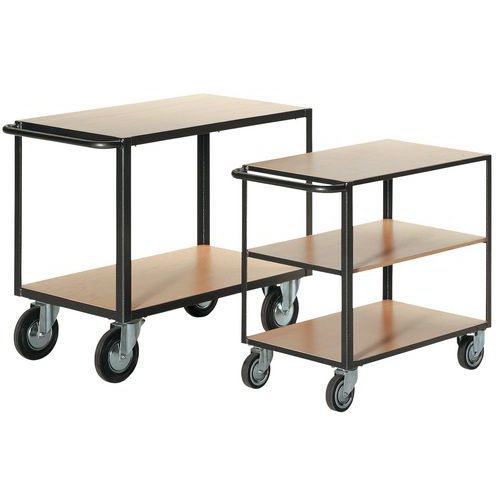 - Carrello con ripiani in legno con telaio in acciaio tubolare. Ripiani in legno MDF resistenti ai carichi pesanti. Adatto a un uso intensivo. Dotato di 4 rotelle girevoli, è facile da manovrare per spostarsi facilmente anche in spazi ristretti. Finitura elegante, perfetto come espositore per i showroom ma allo stesso modo efficace in magazzino, biblioteca o officina.