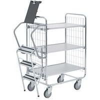 Carrello con scala con 3 ripiani, stabile, per la preparazione di ordini in magazzino.
