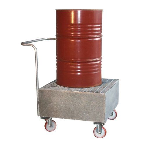 Carrello metallico con vasca di ritenzione dotato di impugnatura di guida per facilitare il trasporto. Griglia rimovibile in acciaio galvanizzato a caldo. Movimentazione a vuoto possibile con carrello elevatore e transpallet. 4 ruote in poliammide: 2 fisse e 2 girevoli, di cui 1 con freno. Finitura in vernice laccata gliceroftalica. Galvanizzato a caldo. Realizzato in Francia Carico statico max. (kg) : 800 Garanzia Cliente : 3 anni