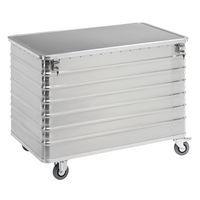Carrello contenitore in alluminio molto robusto. I bordi superiore e inferiore del carrello contenitore sono rinforzati. Coperchio con cerniera con 2 attacchi basculanti, con serratura. Dotato di 2 rotelle fisse e 2 rotelle girevoli con freno.