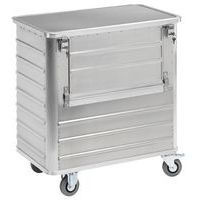 Carrello contenitore in alluminio con sponda frontale semiribaltabile. I bordi superiore e inferiore del contenitore sono rinforzati. Coperchio con cerniera con 2 attacchi basculanti, con serratura. Dispone di 2 rotelle girevoli con freno e 2 rotelle fisse.