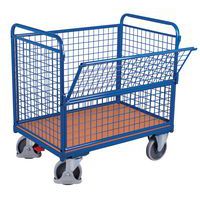 - Su ciascun lato, un mezzo pannello ribaltabile facilita le operazioni di carico e scarico. Maniglia ergonomica in altezza, in tubolare 35 x 20 mm per una buona presa. Il prodotto viene fornito pronto per l'uso: un risparmio di tempo per i professionisti, ad eccezione della maniglia da montare. Rivestimento a griglia: maglia 50 × 50 mm. 2 ruote fisse combinate con 2 ruote girevoli con freno in gomma TPE Ø 160 mm su cuscinetti a sfere, antitraccia, silenziose. Sforzo iniziale ridotto del 50%. Conforme alla norma EN 1757. Su richiesta: attacco + timone per l'avviamento.