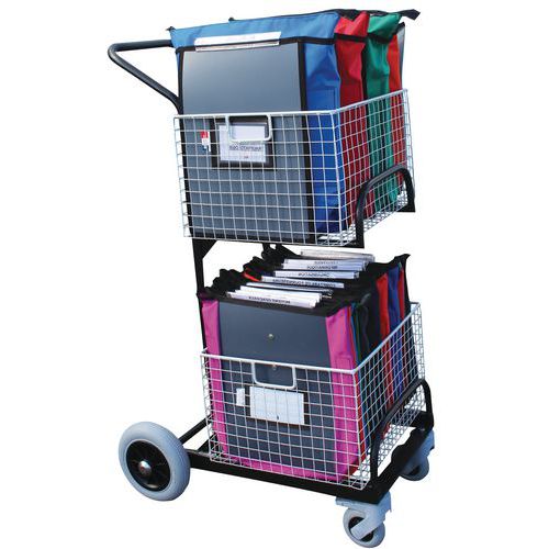 Carrello di distribuzione posta compatto con impugnatura rotonda. Cestini con dimensioni utili LxPxA 450x400x180 mm. Carico ammesso 25 kg per cestino. 2 ruote posteriori diametro 200 mm. 2 ruote anteriori direzionali diametro 100 mm. Telaio tubolare in acciaio saldato meccanicamente con rivestimento in resina epossidica. Corpo delle ruote in polipropilene, battistrada in schiuma di poliuretano su cuscinetti.