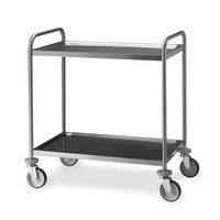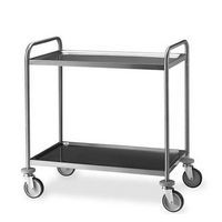 Realizzato completamente in acciaio inox AISI 304, finitura spazzolata. Struttura in tubo tondo di diametro cm 2,5. Piani stampati a forma di vassoio con superfici arrotondate, insonorizzati e saldati al telaio. Paracolpi in gomma grigia. Ruote piroettanti di diametro cm 12,5.