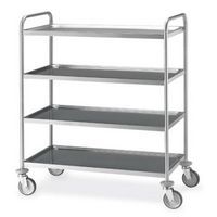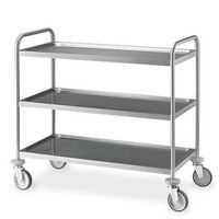 Realizzato completamente in acciaio inox AISI 304, finitura spazzolata. Struttura in tubo tondo di diametro cm 2,5. Piani stampati a forma di vassoio con superfici arrotondate, insonorizzati e saldati al telaio. Paracolpi in gomma grigia. Ruote piroettanti di diametro cm 12,5. Portata (kg) : 150