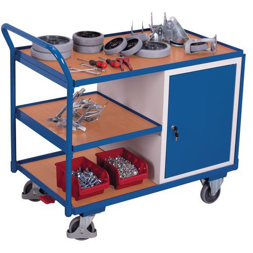 | Descrizione | Carrello ergonomico con 3 ripiani in legno e armadietto, Portata: 250 kg, Altezza totale: 1010 mm |
