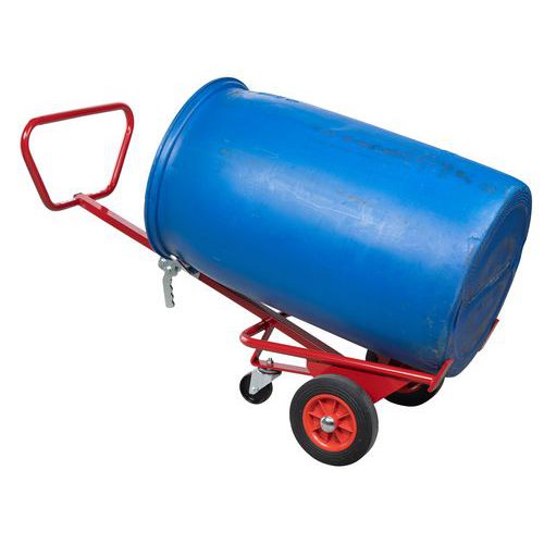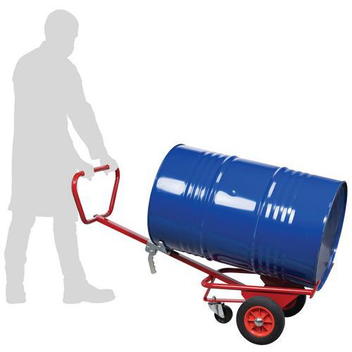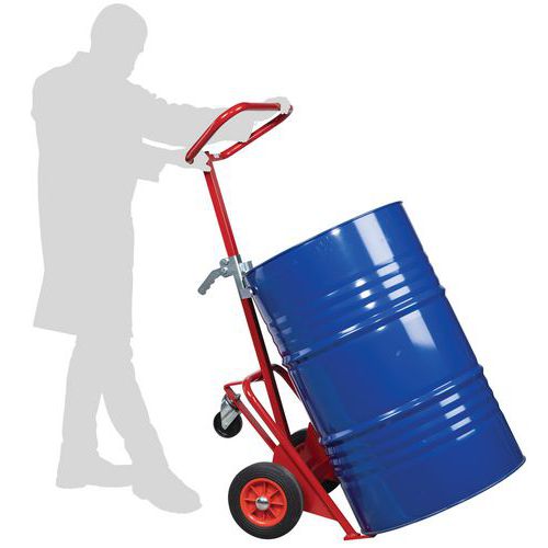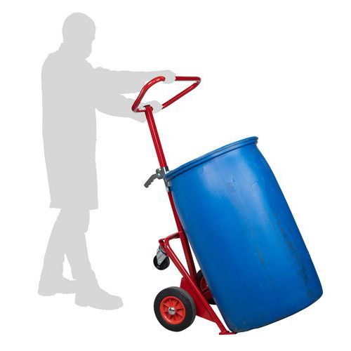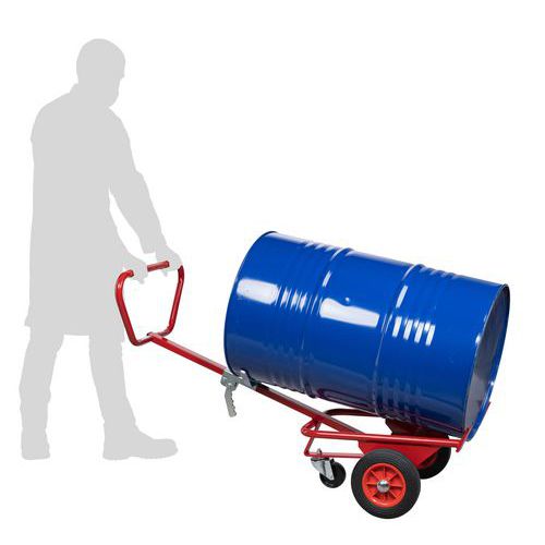 Carrello per fusti robusto e in acciaio saldato meccanicamente. Sforzo attenuato sulla schiena, sulla nuca e sulle spalle grazie all'impugnatura ergonomica. Lavoro sicuro: blocco del fusto con maniglia. Ruota di sostegno in nylon per facilitare il ribaltamento del carico. Per fusti in plastica e in metallo 220 L
