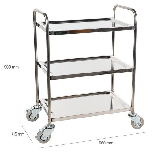 | Descrizione | Carrello inox, Portata: 100 kg, Altezza totale: 900 mm, Larghezza totale: 415 mm, Lunghezza totale: 660 mm |