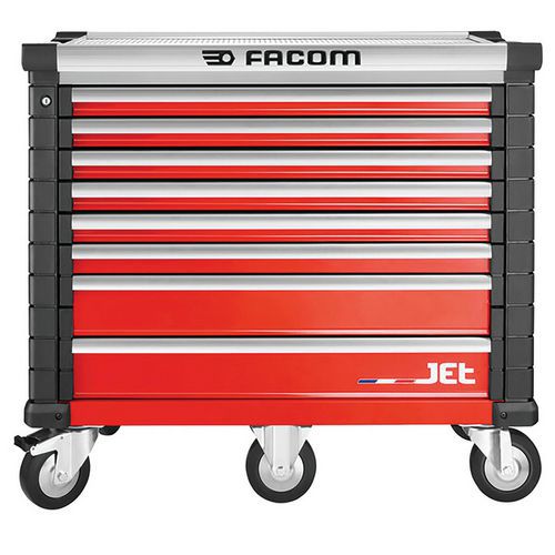 Carrello portattrezzi JetM5 composto da 8 cassetti in grado di contenere fino a 40 moduli e con capacità utile di 250 L.