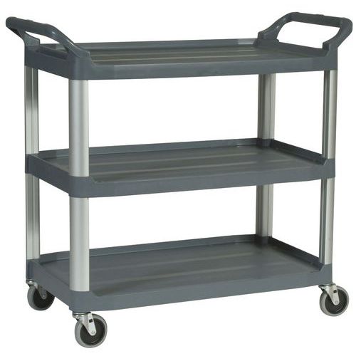 - Questo carrello polivalente è di qualità Premium. Montanti in alluminio estruso. 3 ripiani in polipropilene e fibra di vetro lisci. Le barre di spinta sono in polipropilene. Quattro ruote girevoli in gomma antitraccia (diametro di 100 mm), di cui due con freno.